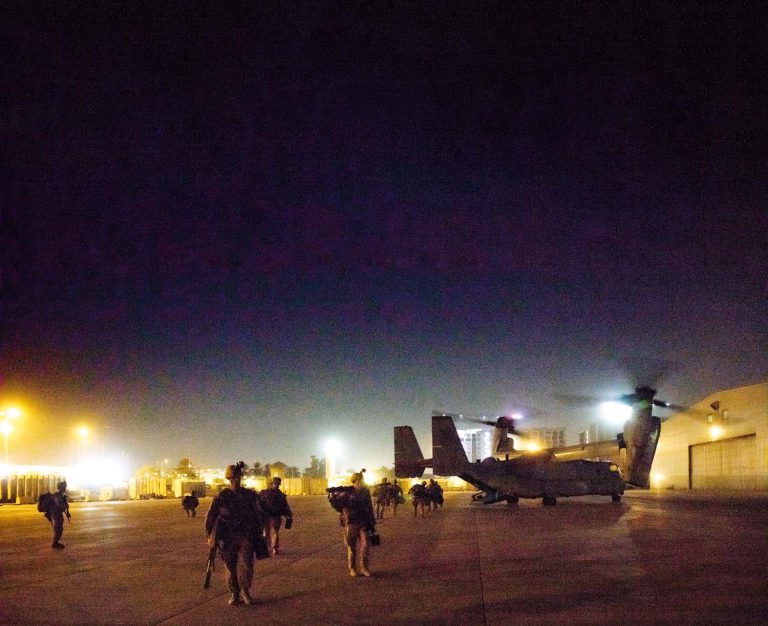 Ces éléments sont tous rattachés à la SPMAGTF-CR-CC, une force de réaction rapide chargée d’intervenir en extrême urgence pour faire face à de telles situations. Les Marines de ce bataillon sont déployés au Moyen-Orient depuis près de six mois et sont parfaitement formés pour ce type d’opération. Vers 17 heures, ordre est donné aux hommes de rejoindre le tarmac pour embarquer à bord des MV-22B de la VMM-161. Trois ou quatre Osprey sont mobilisés pour projeter les « Leathernecks » du 2/7. Chaque « convertible » a la capacité d’embarquer entre 24 pax (assis sur les sièges) et 32 pax (assis sur les sièges et sur l’allée centrale). Pour cette mission, les Marines du 2nd Battalion sont exclusivement équipés de leur armement individuel et de leur sac réglementaire. Aucun matériel ou armement lourd n’est embarqué à bord des Osprey.