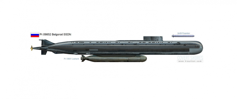 Lancé le 23 avril 2019, le programme a connu de nombreux retards. Son équipage est de 110 sous-mariniers. Il pourrait atteindre une profondeur de 500 à 520 mètres (contre 300/350 mètres pour les sous-marins existants). Il est équipé de deux réacteurs OK-650M.02 qui lui assurent une puissance totale de 190 MW. C’est à la fois un navire destiné aux opérations spéciales, un navire espion et le vaisseau mère pour le mini sous-marin AS-12 Losharik (projet 10831) destiné à plonger à de grandes profondeurs et craint pour ses possibilités d’action contre les câbles sous-marins. Mis en service en 2003, il a été victime d’un accident le 1er juillet 2019 qui a tué quatorze officiers en mer de Barents. Depuis, ce sous-marin est en complète refonte. Le Belgorod devait être basé à Olenya Bay sur la côte de la mer de Barents situé à une centaine de kilomètres de la frontière norvégienne où il aurait pu agir sur l’espace marin arctique mais sa mission a été changée du fait de l’indisponibilité de longue durée de l’AS-12.