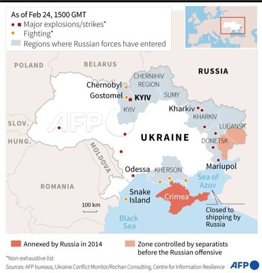 À l’est, des unités blindées russes ont progressé pour s’emparer de la totalité des oblasts (provinces) ukrainiennes de Donetsk et de Lougansk. Elle ont aussi visé la ville de Kharkov. Toutefois, les forces ukrainiennes ont réussi à résister à l’avancée de certaines colonnes limitant leur progression à quelques kilomètres.