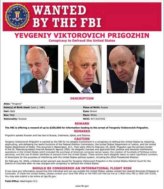Evgueni Prigojine alias le « cuisinier de Poutine » est un ancien petit truand parvenu à se hisser dans les hautes sphères du Kremlin en faisant fortune dans la restauration. C’est lui qui financerait la société Wagner. Il est recherché aux États-Unis (c/f ci-dessous).
