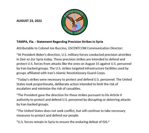 Le Commandement central des forces américaines, l’US CENTCOM a affirmé que les frappes avaient été « proportionnées, et volontairement limitées pour éviter le risque d’escalade et de pertes humaines ».