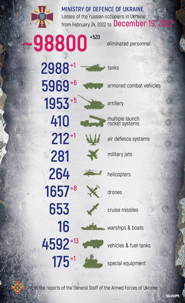 Les deux principaux responsables militaires russes, le ministre de la défense Sergueï Choïgu et le chef d’état-major général, le général Valeri Gerassimov, paraissent toujours aussi incompétents et la question qui se pose est : pourquoi Poutine ne les a pas remplacé ? Les rumeurs courent de temps sur la disparition de l’un ou de l’autre (ils se seraient rendus séparément mi-décembre en Ukraine et Gerassimov aurait fait l’objet d’une tentative de neutralisation par les forces ukrainiennes ; il s’en serait sorti indemne).