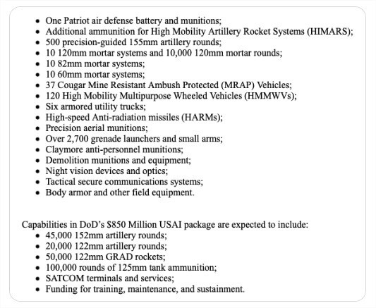 Mais Washington a de nouveau annoncé des livraisons de matériels militaires supplémentaires dont un système sol-air Patriot, des roquettes pour les systèmes d’artillerie HIMARS, des missiles anti-radar, des bombes à guidage laser, des obus, des véhicules…