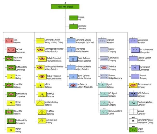 Jusqu’en 2006, l’armée de terre russe comptait trois divisions blindées, seize divisions de fusiliers motorisés et six divisions mitrailleuse artillerie. Les niveaux de commandement s’étalaient entre le district militaire – l’armée – la division – la brigade. À l’époque, une grande réforme de simplification avait eu lieu visant à supprimer l’échelon division en ne gardant que les brigades.