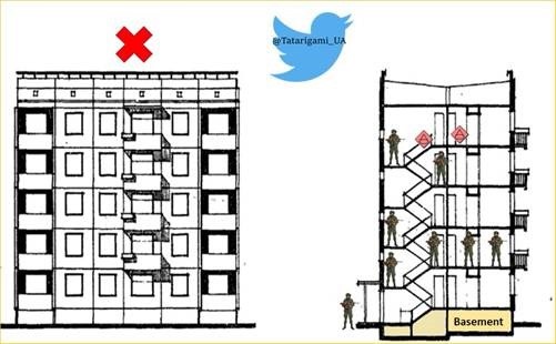 Il est formellement interdit de placer des postes d’observation sur les toîts car ils sont trop repérables par l’adversaire, en particulier depuis l’emploi généralisé de drones. Ces emplacements doivent être installés dans les derniers étages des immeubles tout en restant le plus camouflés possible.