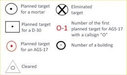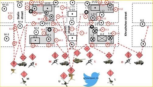 Il est recommandé d’attribuer de nouveaux noms aux rues et aux bâtiments afin de confondre les défenseurs et de pouvoir ainsi exploiter les canaux de communications ouverts. Dans le cas dépeint ci-dessous, les assaillants ont nommé les rues « Lénine », « Staline » et « Khrouchtchev ».