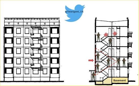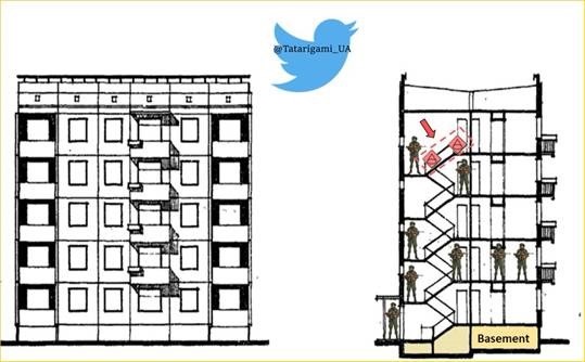 La section commence à monter dans les cages d’escalier par groupes de trois hommes, chaque combattant couvrant son camarade le plus proche. Chaque appartement est reconnu en prenant en compte le nombre de pièces.
