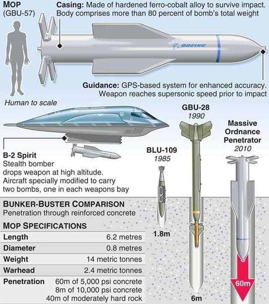 Les MOP GBU-57 d’un poids de 13.600 kilos sont des bombes guidées par GPS spécialement conçues pour pénétrer des cibles hautement fortifiées telles que les installations souterraines. Elles peuvent toucher leurs objectifs avec une très grande précision.