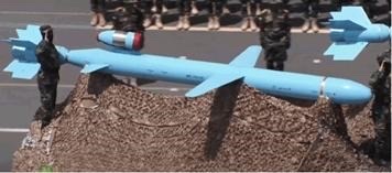 Une des photos permet de voir une version des missiles de croisière sol-sol iraniens  de la famille « Soumar » avec des ailerons fixes. Le nom exact de cette variante est inconnu. Il semble qu’il s’agisse des mêmes missiles que les Houthis du Yémen ont appelés Quds-3 (photo de droite ci-après). Leur portée serait de 1.500 à 3.000 kilomètres.