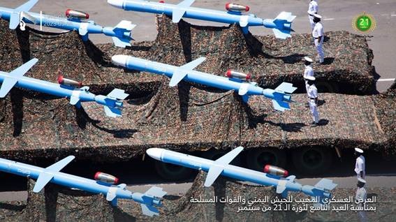 L’armement lourd de la « marine » houthi est surtout composé de missiles sol-mer qui peuvent couvrir la Mer rouge et le Golfe d’Aden. Les noms donnés sont souvent semblables à ceux d’armements iraniens mais – dans un souci de confusion évident -, ne correspondent généralement pas aux même types d’armes : missile Al-Rabij, Falq, Mandab 1, Sejil, Mandab 2, Mion, Sayyad (nouveau missile de croisière d’une portée allant jusqu’à 800 km fonctionnant au combustible solide et liquide avec un charge de 200 kilos).