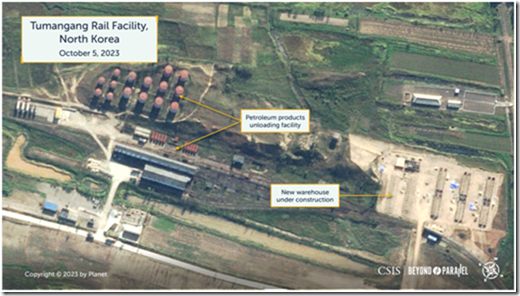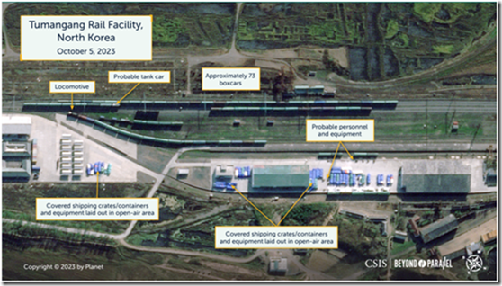 L’imagerie satellite prise le 5 octobre 2023 montre un nombre sans précédent de 73 wagons, environ alors que l’analyse des images satellite accessibles au public au cours des cinq dernières années n’en dénombrait qu’une vingtaine.