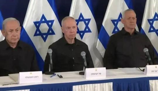 Conférence de presse conjointe du Premier ministre Benjamin Netanyahu, du ministre de la Défense Yoav Gallant et de Benny Gantz (opposition), ministre au sein du cabinet de guerre.