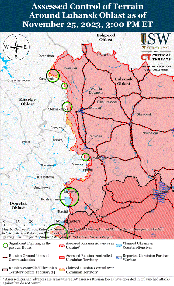 Dans son discours du 30 novembre, il précise : « dans tous les grands secteurs où un renforcement est nécessaire, il devrait y avoir une impulsion et une accélération de la construction de structures Cela implique évidemment la plus grande attention aux secteurs d’Avdiivka et d’autres secteurs de la région de Donetsk. Dans la région de Kharkiv, cela signifie le secteur de Koupiansk et la ligne Koupiansk-Lyman».