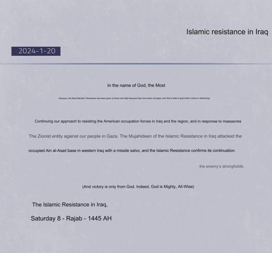 La base aérienne d'Al-Asad située à environ 180 kilomètres à l'ouest de Bagdad dans la province d'Al-Anbar en Irak, où sont stationnés des militaires et des sous-traitants américains, a fait l'objet d'un tir massif de missiles lancés par des groupes militants se revendiquant de la « Résistance islamique en Irak »(RII), un conglomérat de milices chiites alignées sur Téhéran. L'attaque aurait submergé les défenses anti-aériennes d'Al-Asad, plusieurs projectiles atteignant l’intérieur du complexe.